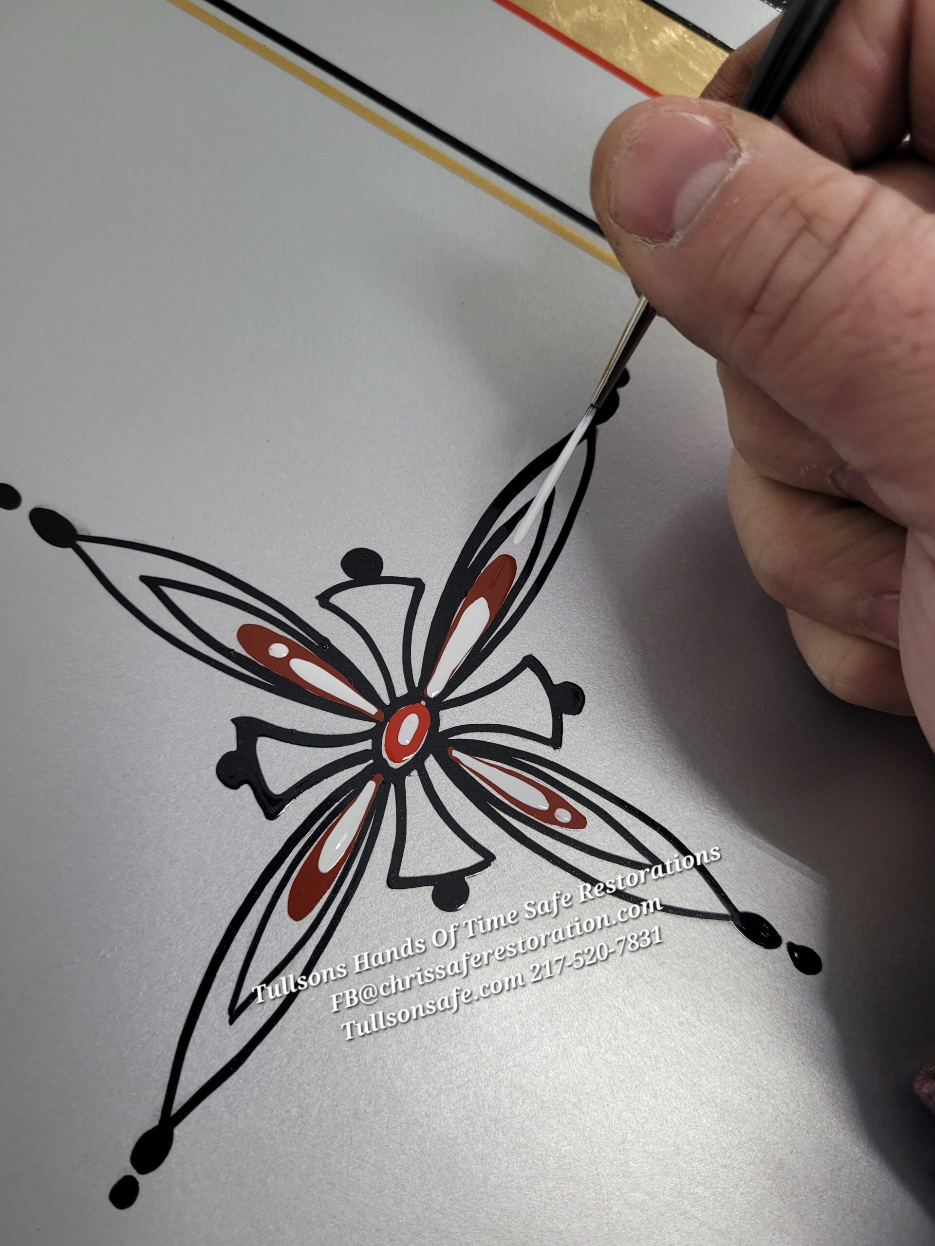 Chris, our skilled artisan applies intricate designs with precision brushes. We create detailed murals tailored to your vision, classic pinstriping for elegant lines and accents, and genuine gold leaf (often 18kt or 23kt) for luxurious highlights and timeless shine. We layer colors thoughtfully, blend shades for depth, and add custom flourishes like scrolls, borders, or personalized motifs. Whether you prefer subtle heritage restoration or bold, statement-making artistry, we match your exact style.